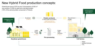 Figure 2. New Hybrid Food production concept: Greenhouse area of 470 ha and 10 bioreactors of 300 m2 can produce 12 000 t/y plant and microbial protein (meaning 10% of the animal protein consumed in Finland). Source: Food without Fields project (2021-2024), funded by Catch the Carbon program of the Ministry of Agriculture and Forestry of Finland