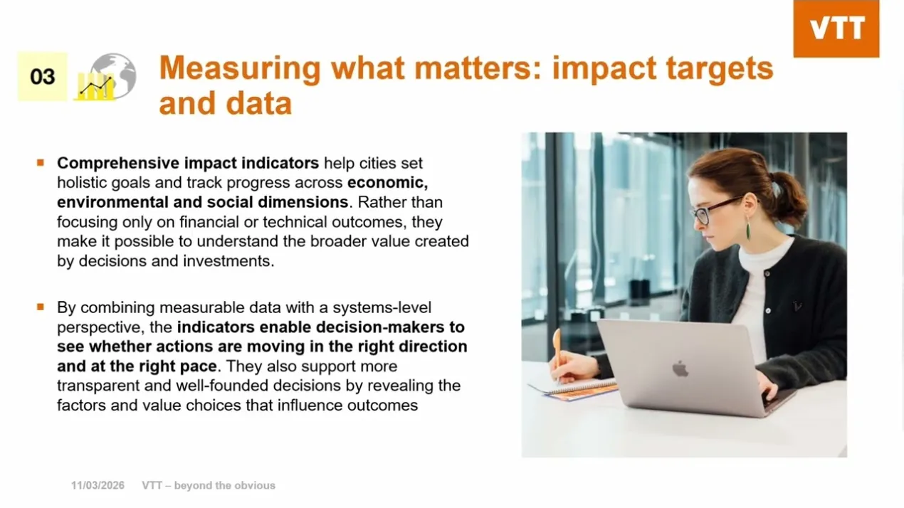 In this session, one of Finland's biggest cities, the City of Espoo and VTT share how they use data, systems thinking and impact models to guide real-world choices on wellbeing, services and sustainability.