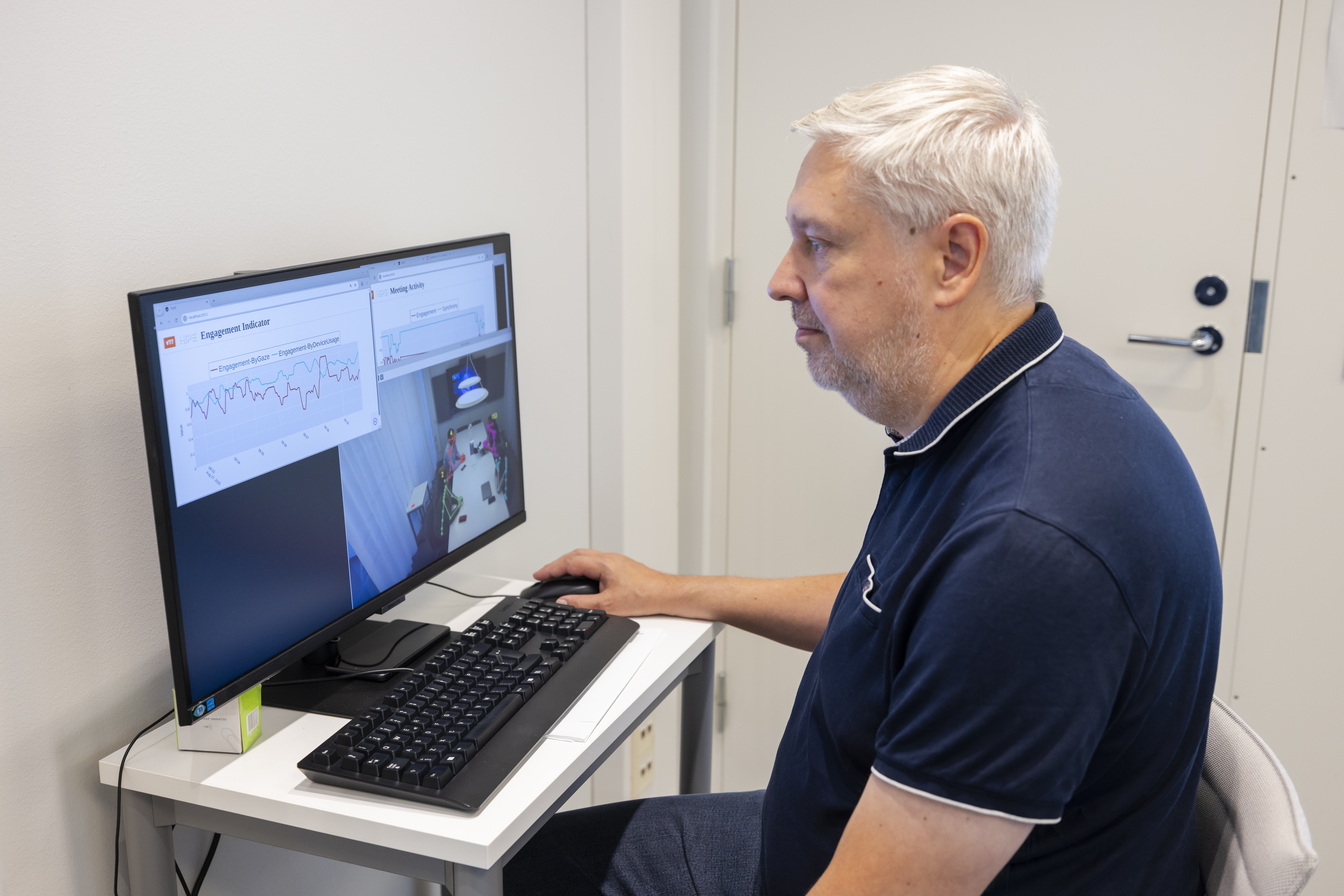 VTT produces video-based analytics including participants' facial direction and whether they are interacting with other participants or with devices (phones, laptops). Chair sensors detect who is speaking, and when and can also provide heart rate variability data when needed.