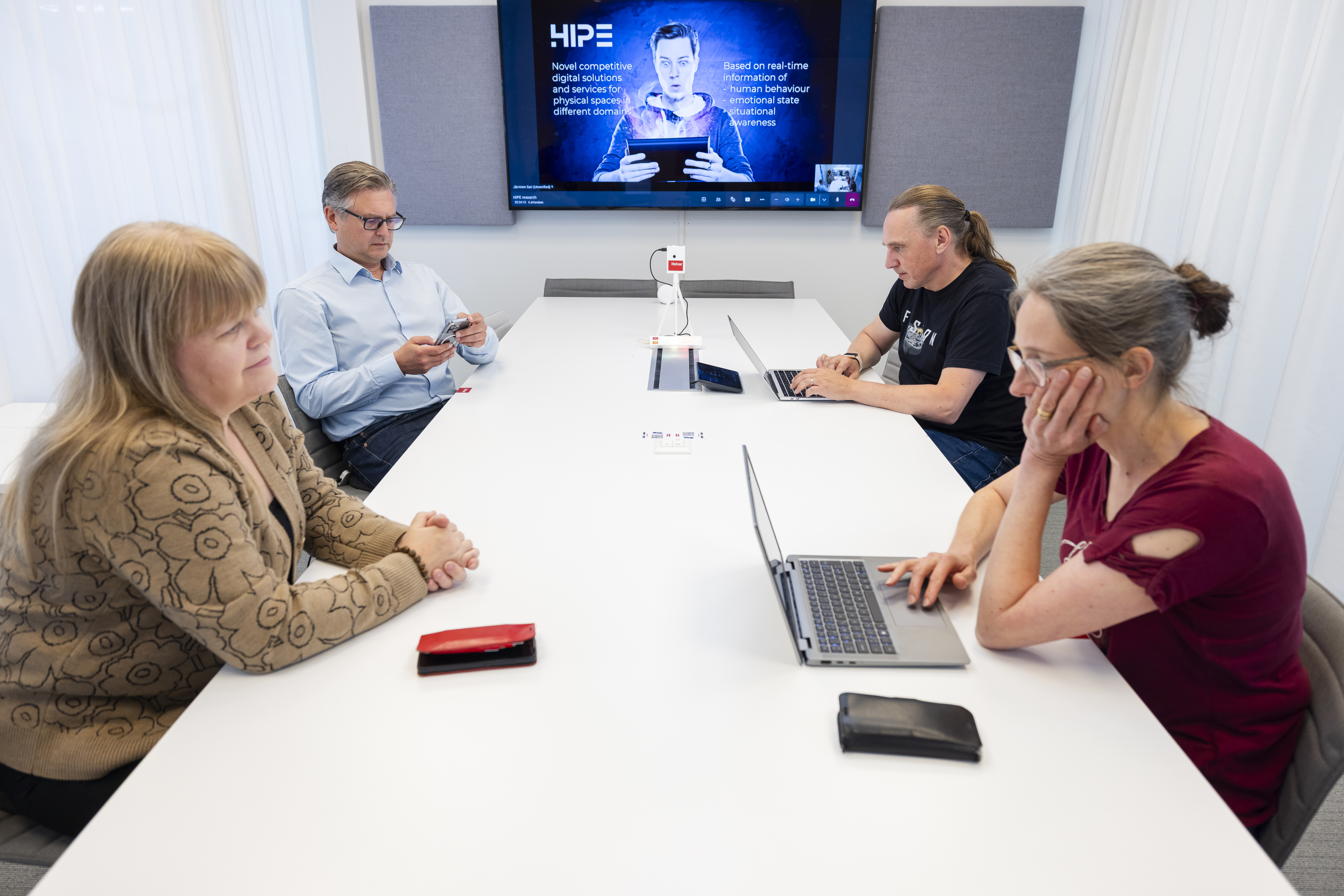 ”Mittaamme neuvotteluhuoneen dynamiikkaa: miten vuorovaikutus sujuu, pysyykö osallistujien huomio kokouksessa, miten aktiivista keskustelu on ja miten ympäristö – valo, ääni, ilmanlaatu – siihen vaikuttaa. Yksityisyydensuoja säilyy, sillä emme kerää tietoja henkilötasolla vaan analyysi tehdään ryhmästä”, kertoo johtava tutkija Johannes Peltola VTT:ltä.